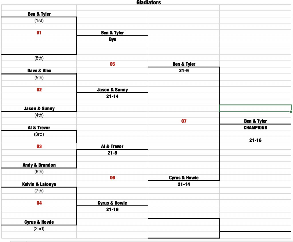 The game and match ended on a great dive, rollout kill by Tyler to give both Ben and Tyler the win and Gladiator division championship. Great playing by Ben and Tyler and awesome to get on the courts with you guys again. Congratulations fellas.